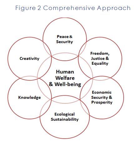 The framework broadly organizes global issues concerning governance and devel- opment under a number of inter-related trust areas: Effective Democracy, Global Security, Ecological Resilience, Development, Educational Advancement, Equitable Prosperity and Cultural Enrichment.