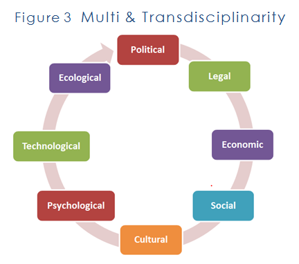 Recognition that social reality is an integral and organic whole composed of multiple dimensions or aspects naturally leads us to examine each issue from a wide range of different disciplinary frameworks in an effort to capture insights into the total reality of which each is a vital component, as depicted in Figure 3. To illustrate, Winston Nagan pointed out how the Academy’s study of employment incorporated legal, economic, social, political, psychological, demographic, technological, ecological and cultural factors.