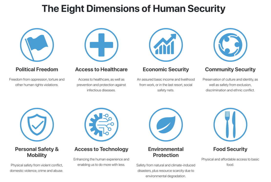 1) In 2012, the UN General Assembly – made up of more than 190 nations as UN Member States – affirmed a common understanding of human security: “The right of people to live in freedom and dignity, free from poverty and despair. All individuals, in particular vulnerable people, are entitled to freedom from fear and freedom from want, with an equal opportunity to enjoy all their rights and fully develop their human potential.”